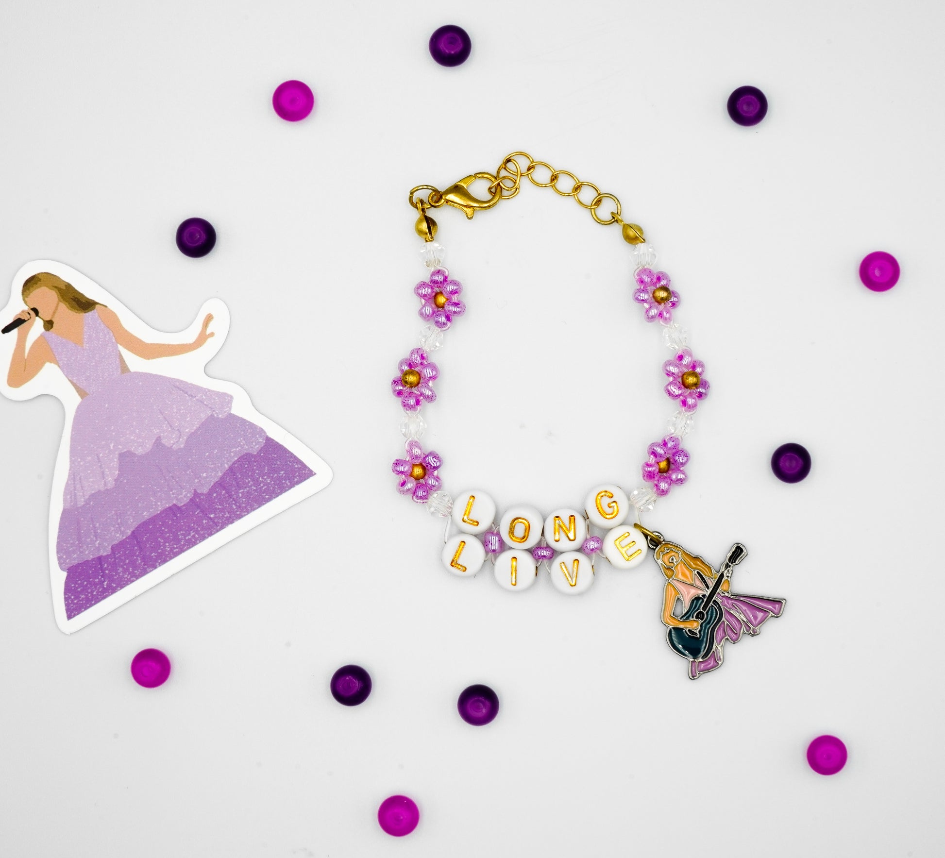 Handmade friendship bracelet, inspired by the song "Long Live" feauturing a Taylor charm!