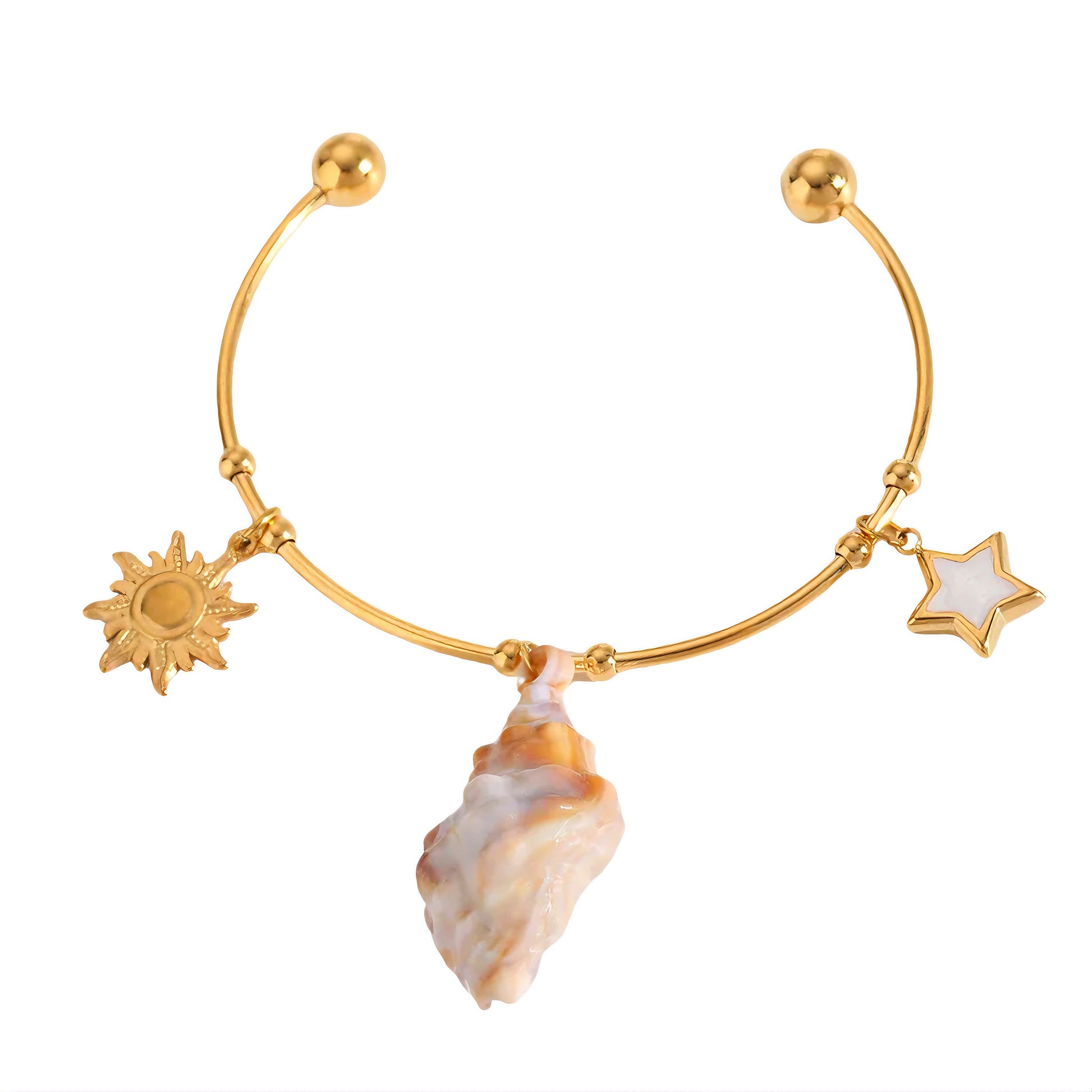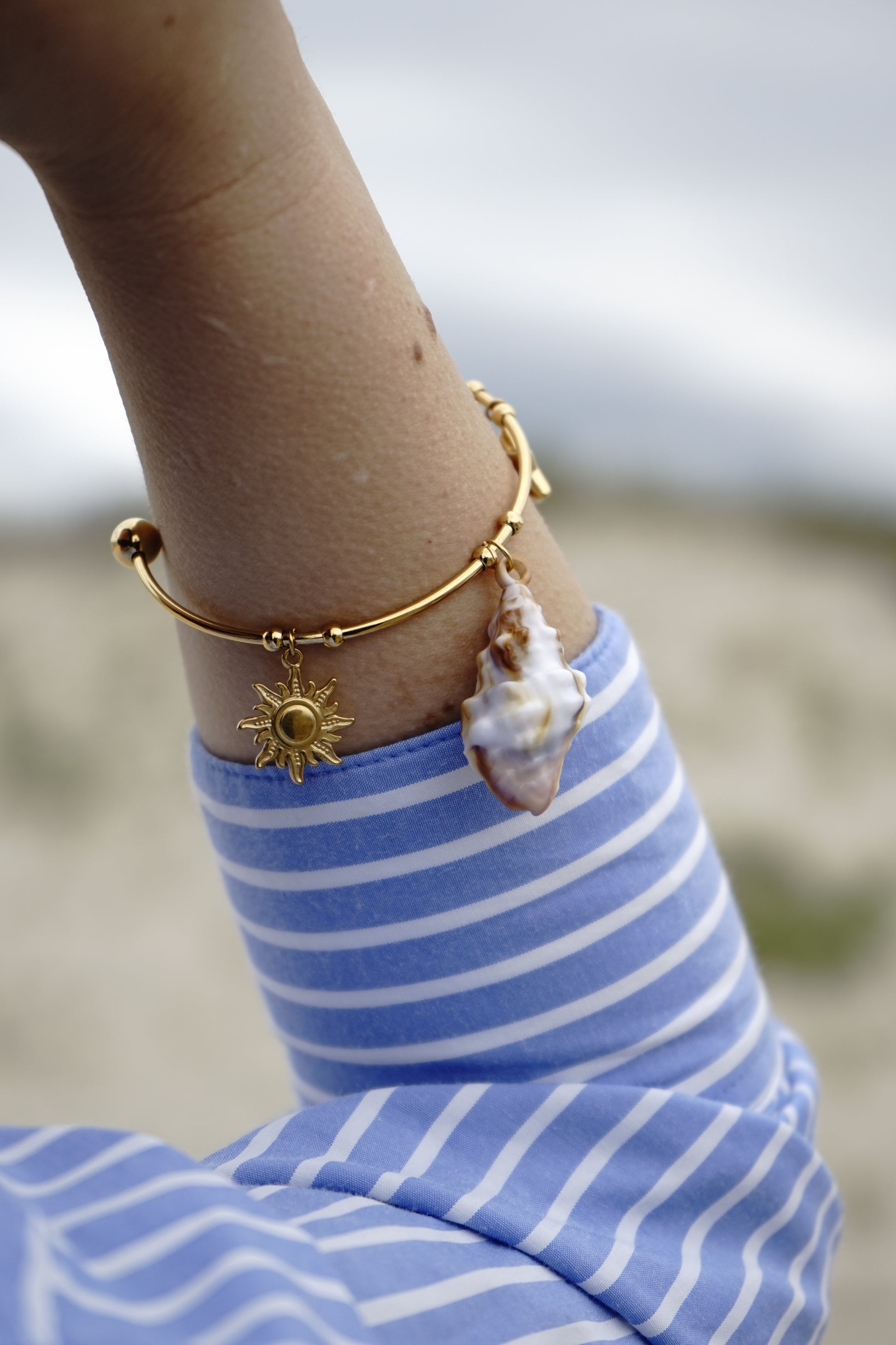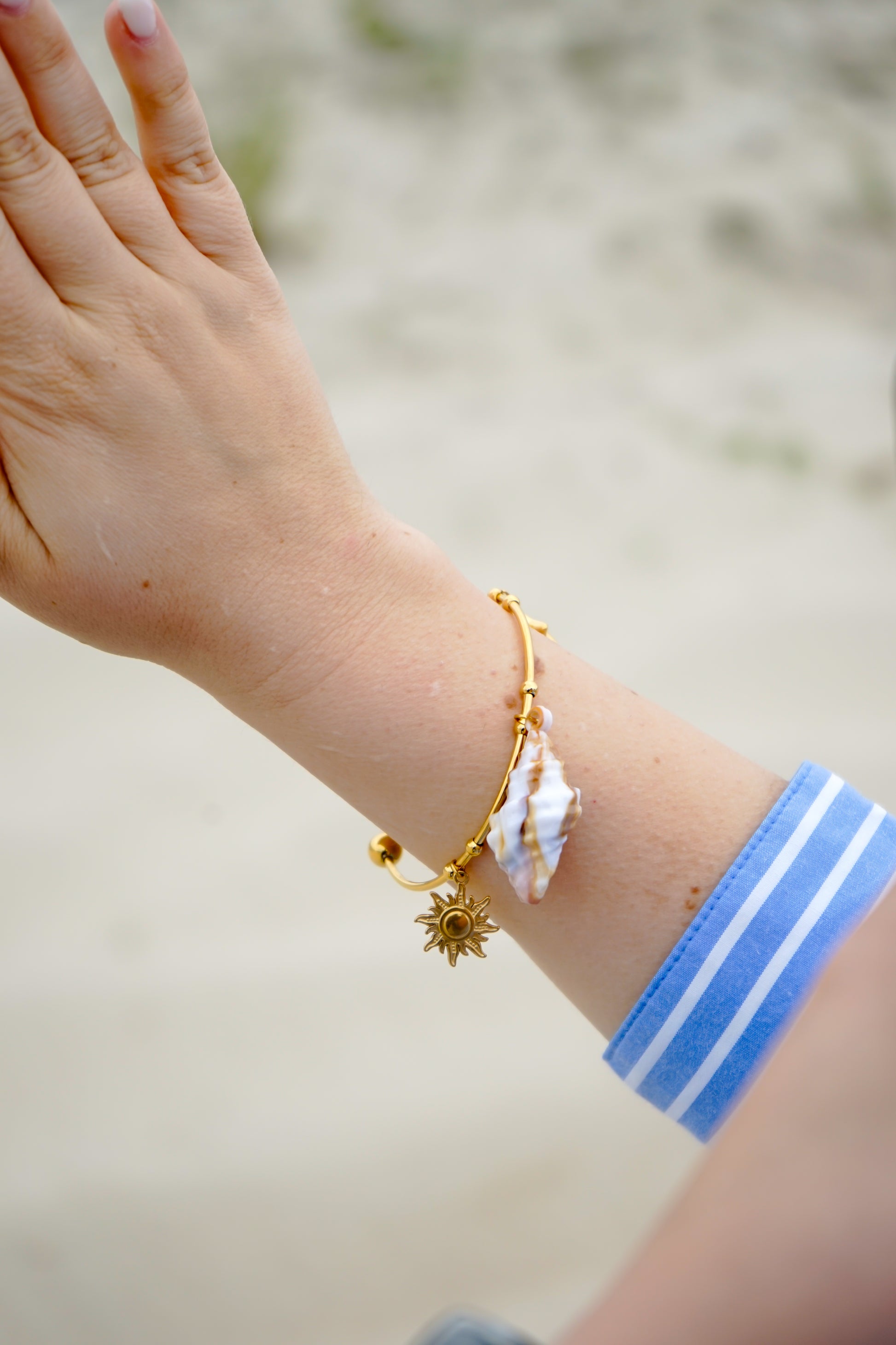 This bangle bracelet is the perfect summer accessory, complete with 3 charms (including a real shell) that add a touch of beachy charm. The adjustable bangle makes it easy to wear and perfect for those warm summer nights.