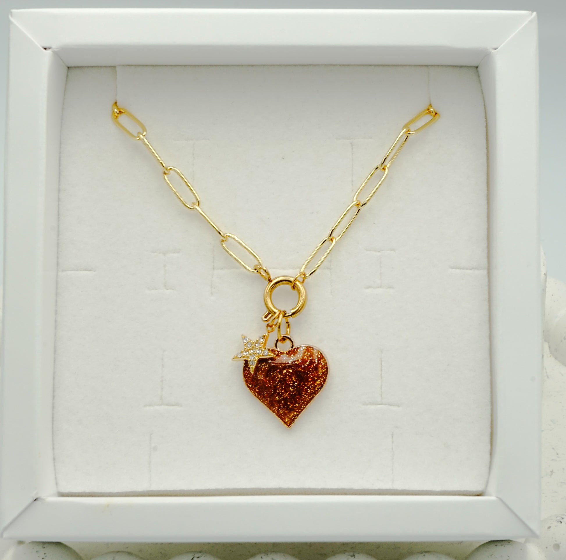 A glittery heart charm inspired by Taylor's new album "The Life Of A Showgirl".
